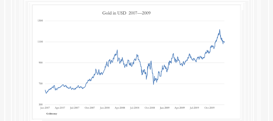In the run up to the crisis, the gold price rose to $1023 in March 2008. The crisis then began to evolve, leading to the Lehman failure on 15 September 2008. The week before the event, gold was trading at $742, a fall of 27% from the March high. And after a brief rally on the news, it subsequently fell back to $692 on 24 October, before rallying to new highs against the dollar.