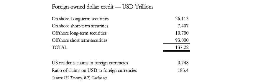 It consists of all dollar investments and interests in foreign hands, both onshore and also in offshore eurodollars, totalling a staggering $137 trillion. Meanwhile, Americans have only $748 billion (with a B!) in foreign currency to absorb dollar liquidation. And it will be a miracle if rising interest rates and bond yields don’t cause initial liquidation of $26 trillion in onshore long-term assets, leading to a wider liquidation of dollar credit. There is simply next to nothing to absorb it.