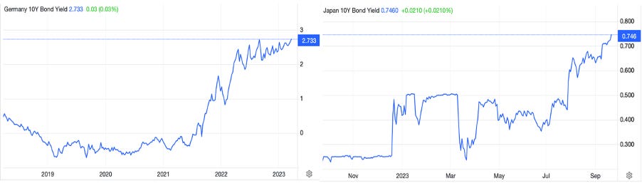 It is not just a problem facing dollar markets. The next two charts show 10-year bund and JGB yields.