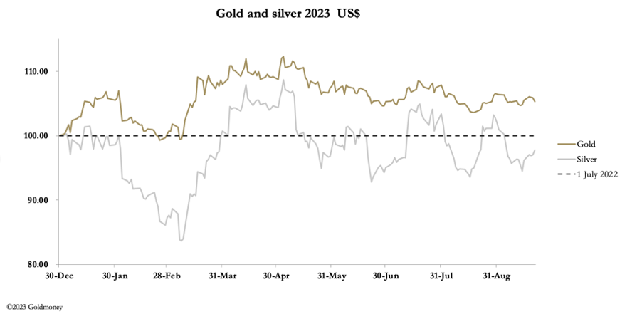 The FOMC and the Bank of England stood pat on interest rates this week. Following the FOMC’s decision, gold and silver fell on the back of its hawkish statement before recovering slightly. In Europe this morning, gold was $1926 up a net $2 from last Friday’s close. Silver fared much better at $23.68, up 65 cents. Silver is obviously in a bear squeeze, while hedge funds have become disinterested in gold.