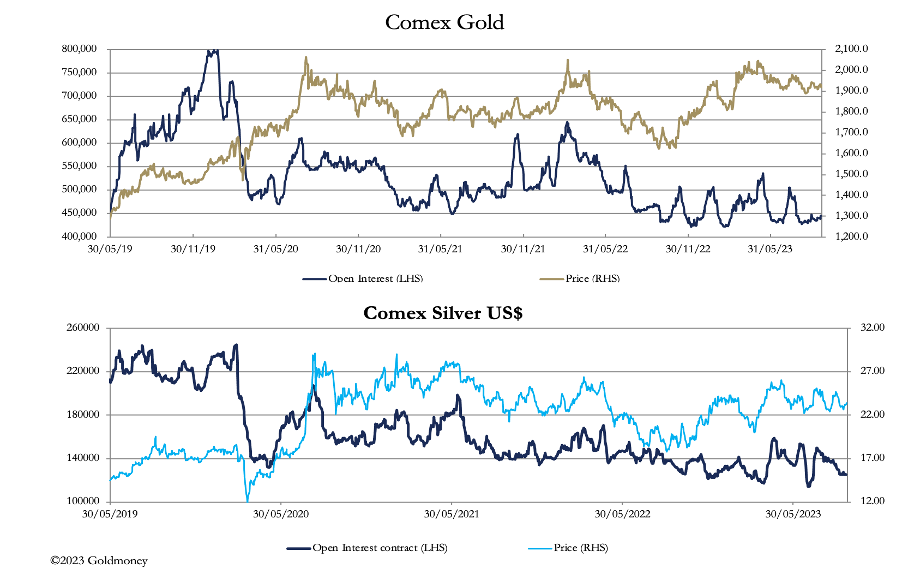 Often, silver leads the way upwards and this may be the case today. The next chart shows how Open Interest on Comex remains low in both contracts, indicating that the downside is limited.