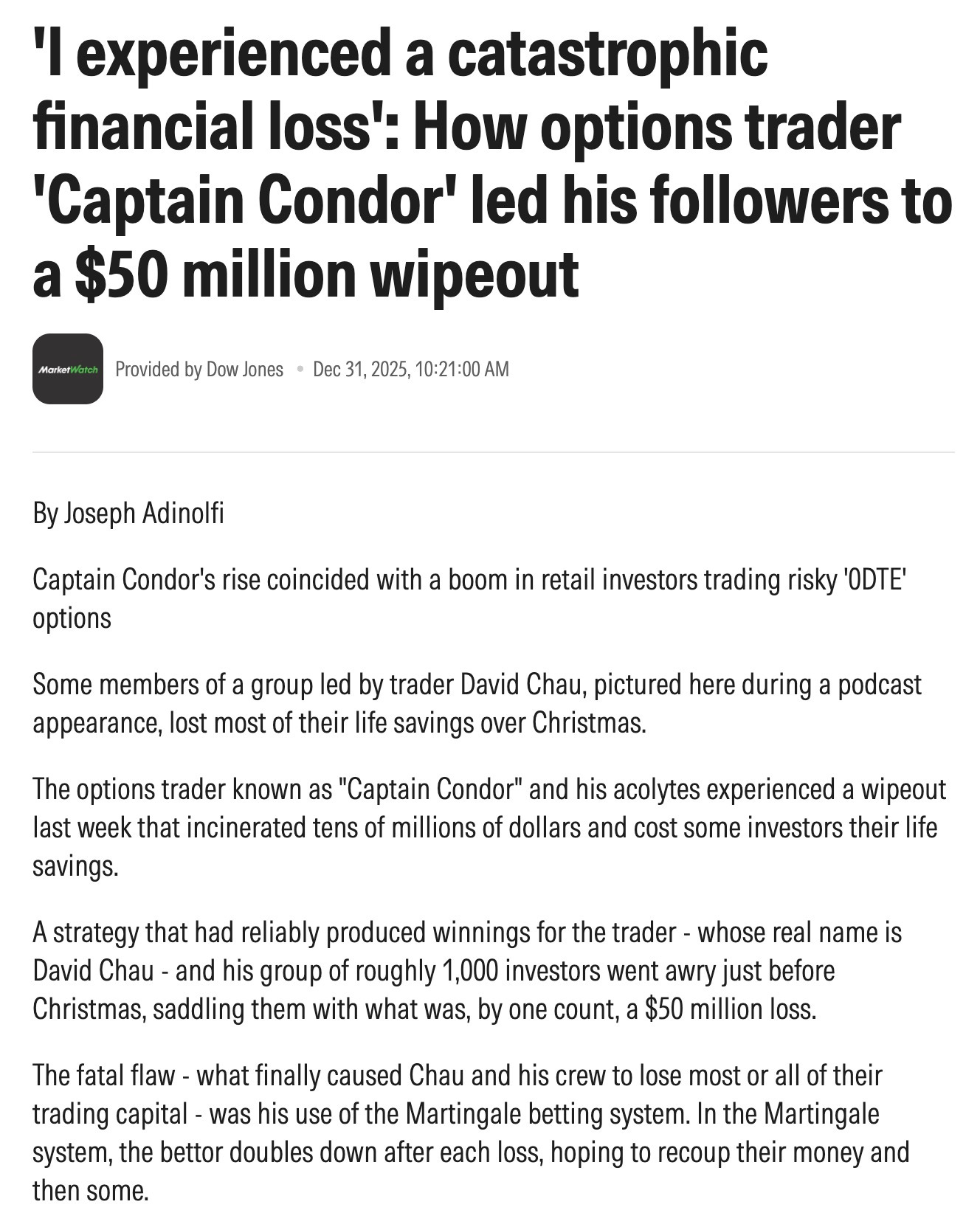 This is what options trader ‘Captain Condor’ found out this month, losing his investors $50 million from implementing a Martingale system (where you keep doubling down on losses). Eventually, you finally lose ‘the big one’.