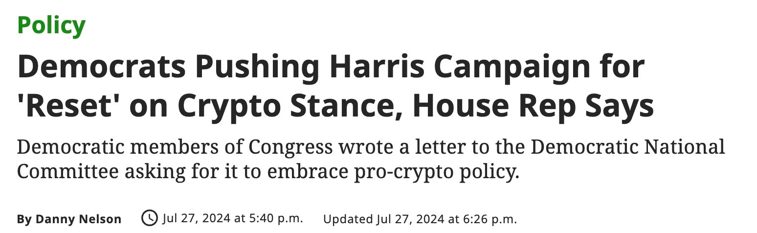This was evident last night when headlines started to cross the wire around the time of Trump’s speech that multiple Democrats were urging Kamala Harris to walk back her stance on being anti-crypto. This is a monstrous pivot, especially given that party cornerstone Senator Elizabeth Warren has been the most outspoken critic of crypto over the last few years. The pivot is too little too late in my opinion — Democrats are already playing second fiddle with crypto adoption.