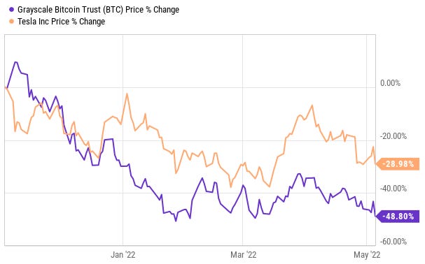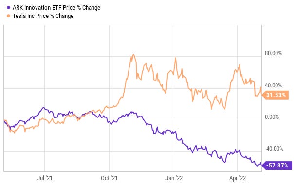 Finally, as I continue to warn on this blog, the number one weighting in the ARKK fund, Tesla (TSLA), is actually still up by 31.5% over the last year. This means that the rest of the components of the ARKK ETF are such hot garbage, the fund is underperforming its number one weighting by an astounding 89%.