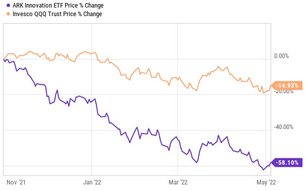 I have been critical of ARK Invest, and their flagship ARKK “Innovation” ETF since the inception of this blog, noting last November - before inflation became an issue, before the war in Ukraine and before the market decided to take a king-sized shit - that Wood’s success seemed superficial and based on temporary trade-winds that were bound to change direction.