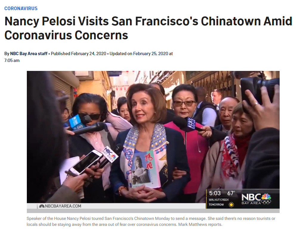 Speaker of the House Nancy Pelosi toured San Francisco’s Chinatown Monday to send a message. She said there’s no reason tourists or locals should be staying away from the area out of fear over coronavirus concerns.