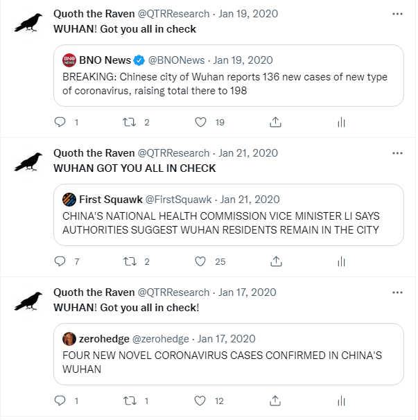 Nobody took Covid seriously in December 2019 or January 2020, which is when I first started reading about it. The signs were there: it was being mentioned on the Bloomberg terminal every day and it was even on the Fox News crawl every day. It wasn’t a major headline yet, but the information was there that China was reporting cases of a new coronavirus in Wuhan. Trust me, I know, because I spent an entire month making Busta Rhymes-themed “Wuhan, got you all in check” jokes before I realized the world may have stepped in some actual shit. Behold exhibit A: