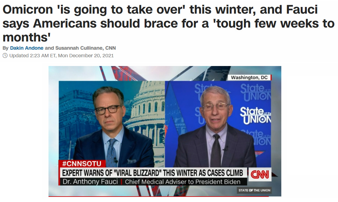 This narrative shift will do a couple of things. First, after this omicron wave passes, it should hopefully stir up a discussion about natural immunity that’s about 18 months overdue. Putting vaccine mandates aside, Omicron, given its extremely infectious nature and mild effects, may wind up acting like nature’s vaccine for almost everybody anyway. People will start to understand this concept and push harder on “the science” as to why it has conveniently ignore the topic of natural immunity - which has been proven to be more robust than vaccination - thus far.