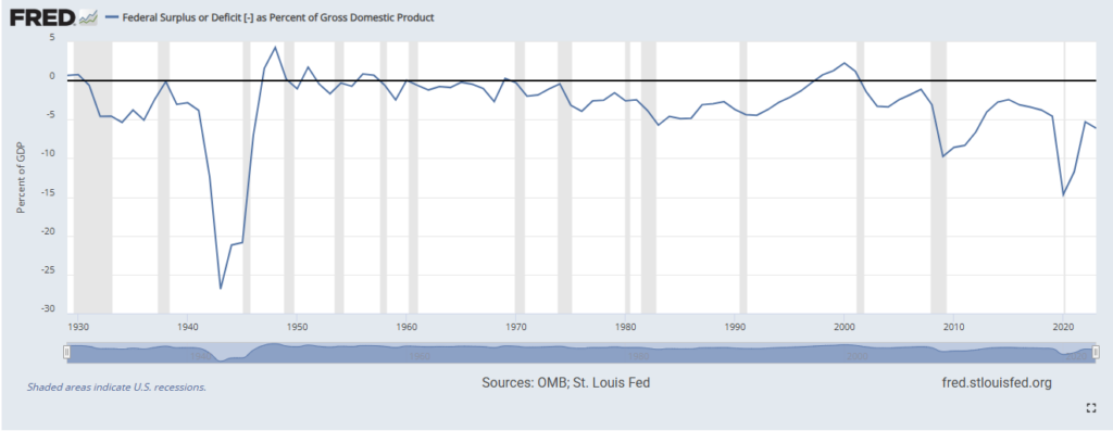 If we go back to World War Two, the only years when the Federal budget deficit has been higher as a share of GDP are the recession and slow recovery years 2009-2012 and the pandemic years of 2020 and 2021. What is worse is that, despite all the “Building Back Better” of the last few years, the Federal budget deficit has actually risen from 5.3 percent of GDP in 2022. Perhaps this vast infusion of borrowed money is why the economy is supposedly “booming.” If so, this sugar rush is not sustainable.