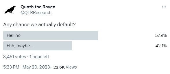 I’ll say up front that I don’t expect a default to happen, though I am intrigued by the facts that (1) my friend Larry Lepard told me over the weekend “they are going to default” and (2) the results of a Twitter poll that I put up a couple days ago show he isn’t alone in his thinking.