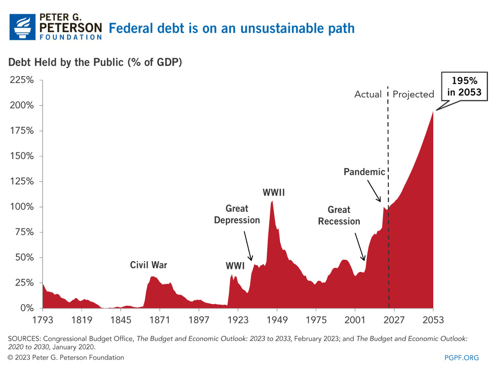 As House Speaker McCarthy has repeatedly noted, the issue for the U.S. is more about spending than generating revenue. If you’re interested in visualizing the conundrum the U.S. has gotten itself in, this slide deck from the Peter G. Peterson foundation is well worth a review. For brevity, here is a key visual of as how askew spending and revenue are, with spending very clearly above historical norms, outpacing revenue which also is above historical norms.