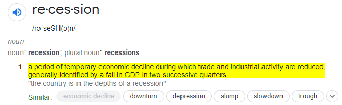 That definition, of course, is “a period of temporary economic decline during which trade and industrial activity are reduced, generally identified by a fall in GDP in two successive quarters”.