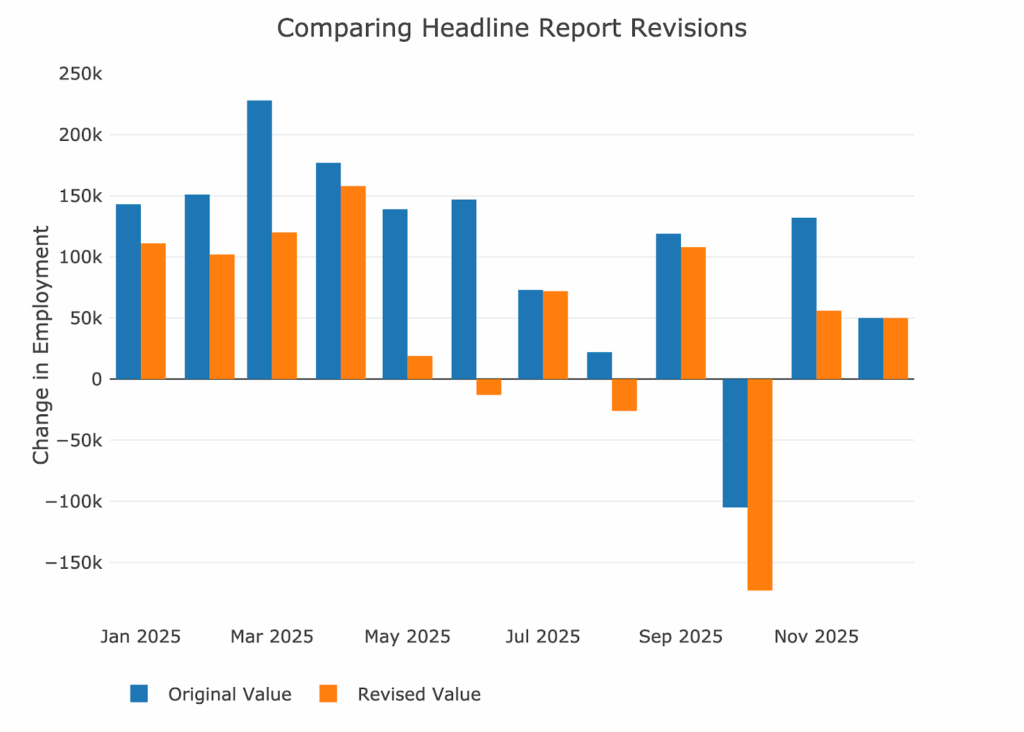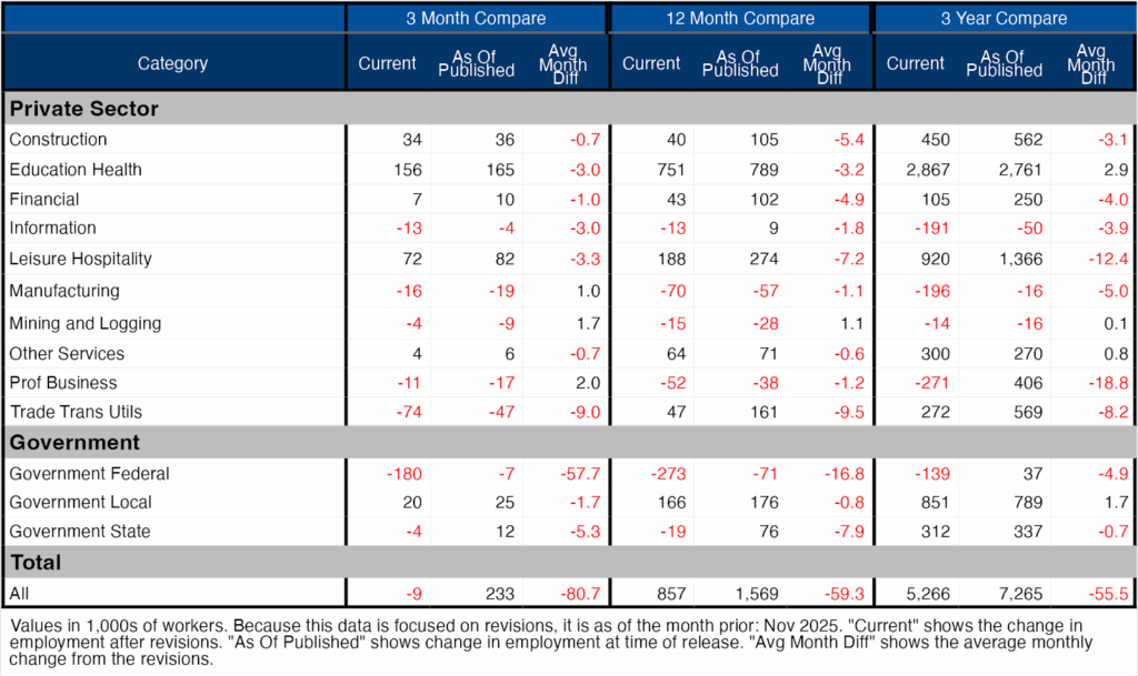 This is the biggest story of the jobs report. Every single month in 2025 has seen negative revisions. This destroys the credibility and integrity of the report. Several months saw massive downward revisions such as March, May, June, August, and now November. Revisions cut the numbers in half or even brought the job growth negative.