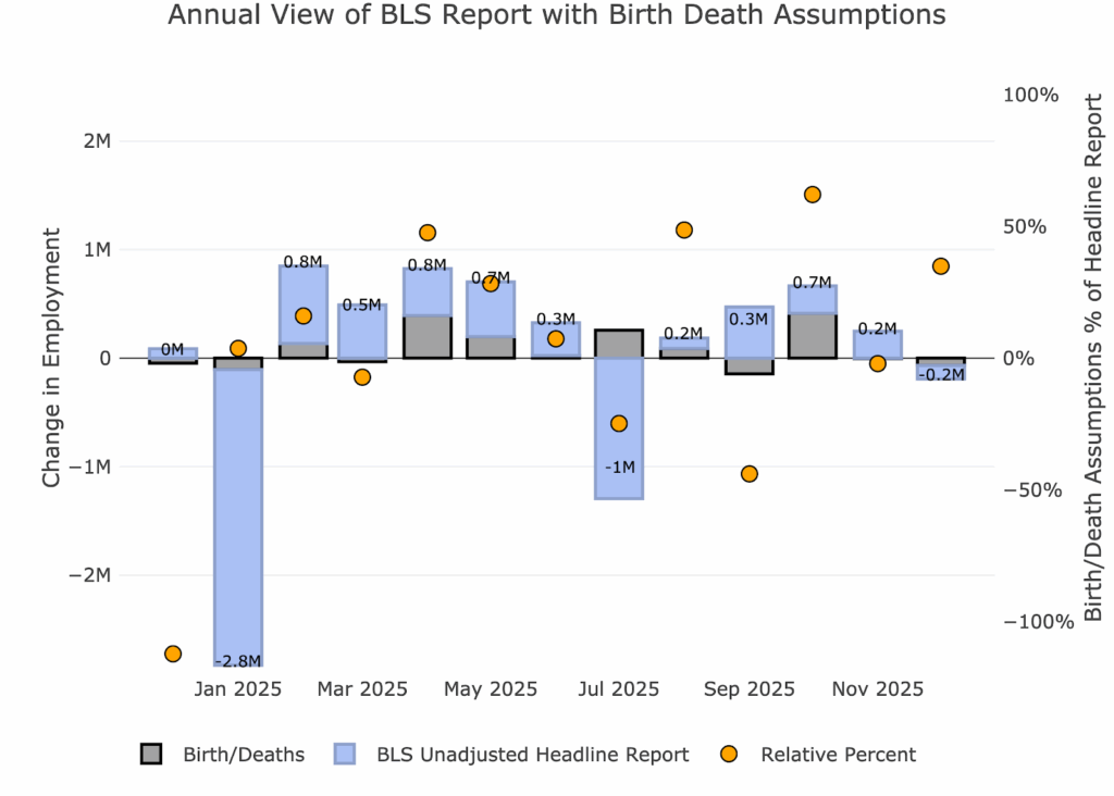 The BLS publishes the data behind their Birth/Death assumptions (formation of new business). In December, the BLS assumed a loss of 67k jobs which is on top of a loss of 125k for the baseline number.