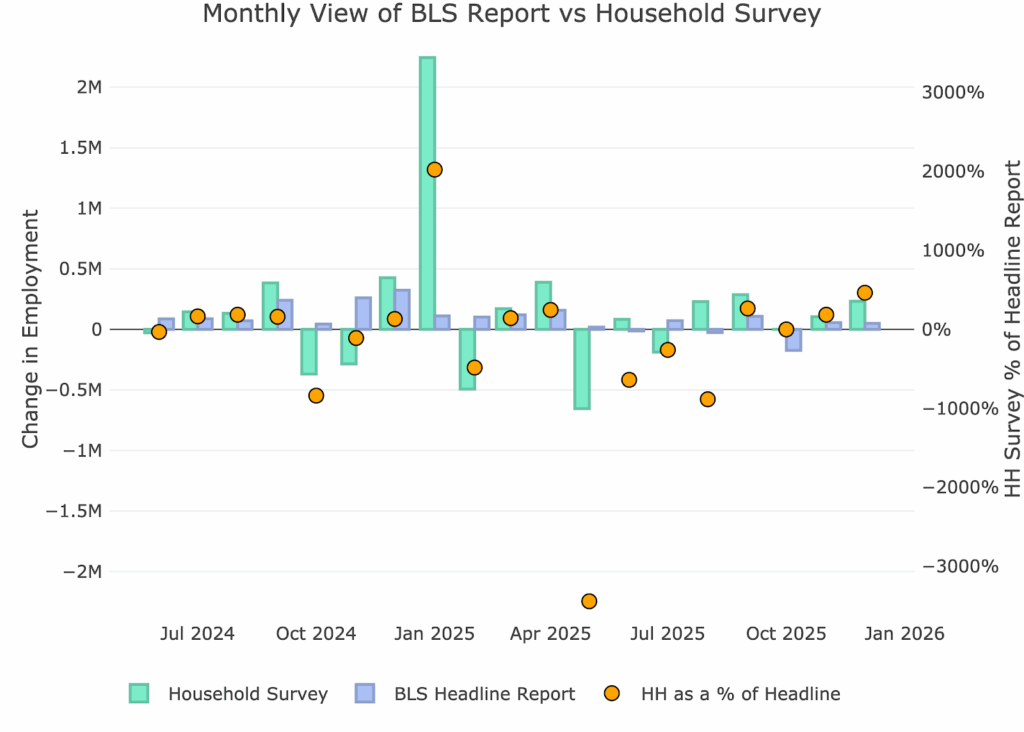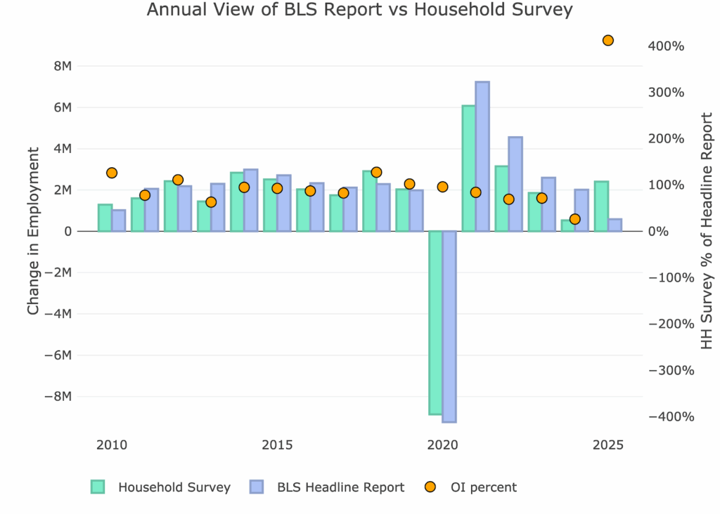 For the year, the Household Survey is significantly higher due to the data anomaly in January. This was a one-time event, but the Household Report has been over performing this year. March, April, June, August, September, November, and December all saw beats by the Household Survey. Not all of these were beats at the time, but the downward revisions of the Headline Report have been severe enough to create the underperformance.