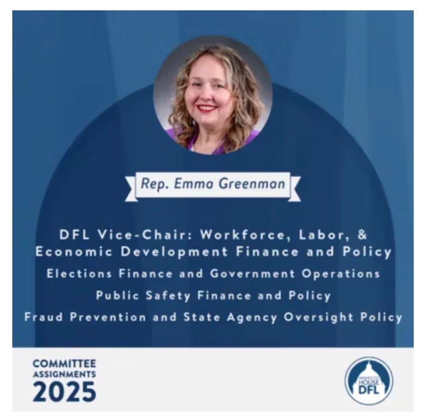 Her official committee assignments include being Co-Vice Chair for Workforce, Labor, and Economic Development Finance and Policy, Public Safety Finance and Policy, Elections Finance and Government Operations and last but not least Fraud Prevention and State Agency Oversight Policy. She is a lawyer with a B.A. in political science and an M.P.A. in “public administration.”