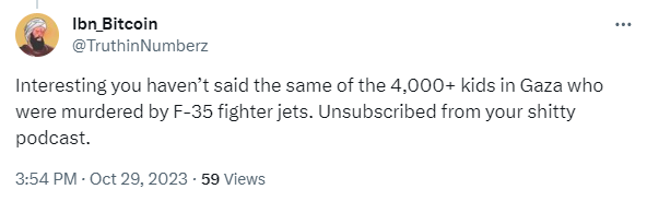 “Interesting you haven’t said the same of the 4,000+ kids in Gaza who were murdered by F-35 fighter jets. Unsubscribed from your shitty podcast.”