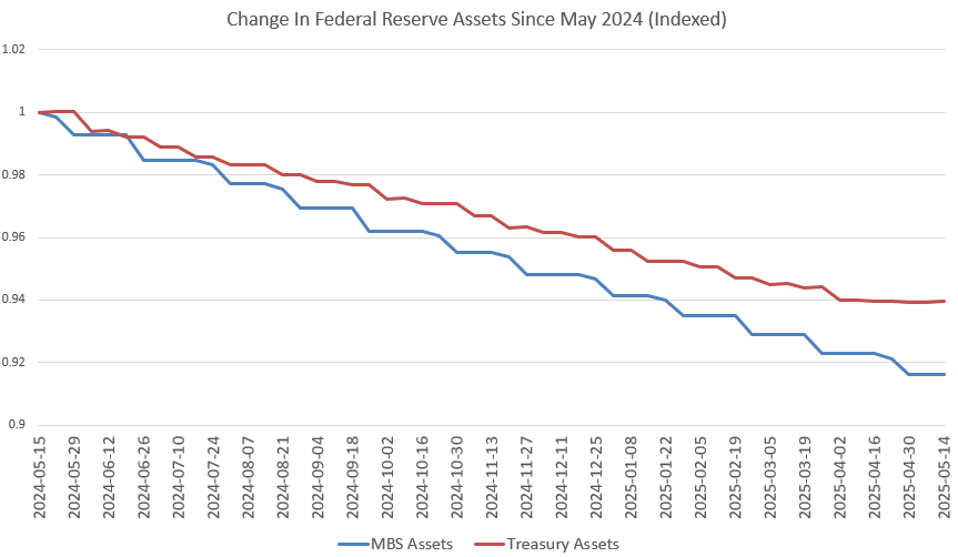 Note that the Fed has repeatedly adjusted its policy over the past year so the reductions in the balance sheet are overwhelmingly focused on mortgages while the Fed finds new ways to hold on to Treasurys, thus minimizing a negative impact on Treasury prices. One could certainly read this as an indication that the Fed is primarily worried about avoiding any fast reductions in Treasury prices.