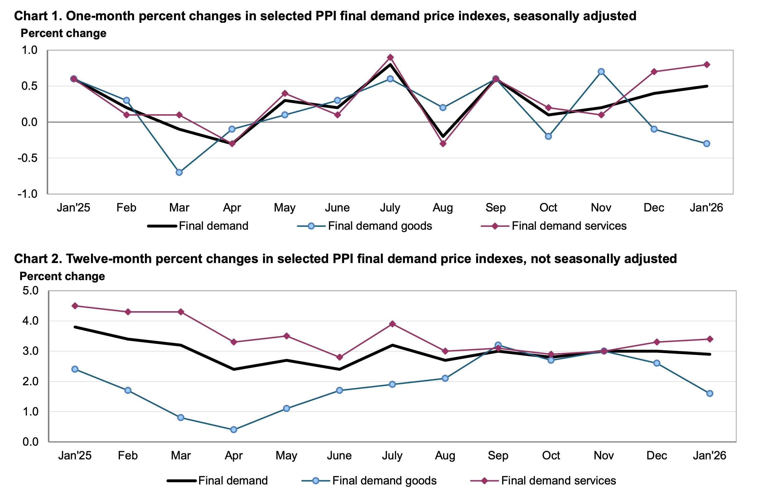 Wholesale prices rose faster than expected in January, with core PPI jumping 0.8% for the month, well above consensus and hotter than December. Headline PPI rose 0.5%. On a year-over-year basis, core wholesale inflation is running at 3.6% and headline at 2.9%. That’s not exactly “mission accomplished” when the Federal Reserve is supposedly aiming for 2%.