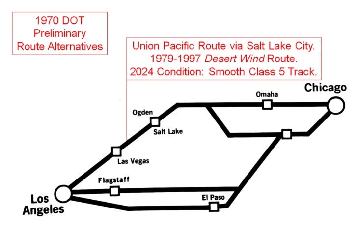 Figure 1. Chicago to Los Angeles preliminary route alternatives, 1970.