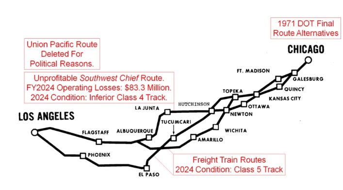 Amtrak asserts that freight trains “interfere” with its passenger services. However, Amtrak often makes questionable route choices despite having legal priority over freight. Between Chicago and Los Angeles, the Desert Wind lost less money than the Southwest Chief. Despite this, Amtrak favored the Southwest Chief, which passed through more congressional districts. It discontinued the Desert Wind in 1997, leaving Las Vegas with no train service.