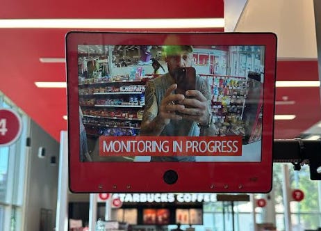 “Monitoring in Progress” a monitor atop of the automated checkout said, while showing me a photo of myself, Orwell-style. “Good,” I thought to myself, “I hope someone is on the other end of this horrific reality show and is watching me endure this shopping experience while making a face like I’m passing multiple kidney stones.”