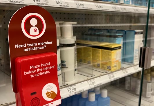 From there, I walked over to get some deodorant and face scrub, both of which were located behind locked cabinets. Each was priced at about $7.99. Then I glanced at an entire wall of unlocked products priced from $13.99 to $20.99 and wondered why these particular items weren’t secured. Lacking the time to question the store's reasoning, I hit the attendant button, reminiscent of a lab mouse pressing a lever for a pellet of food in some of sort of Pavlovian experiment.