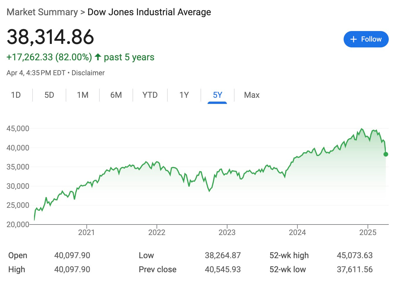 The Dow Jones is trading at about 38,000 — where it was almost one year ago to the day. It’s still up 82% over the last 5 years.