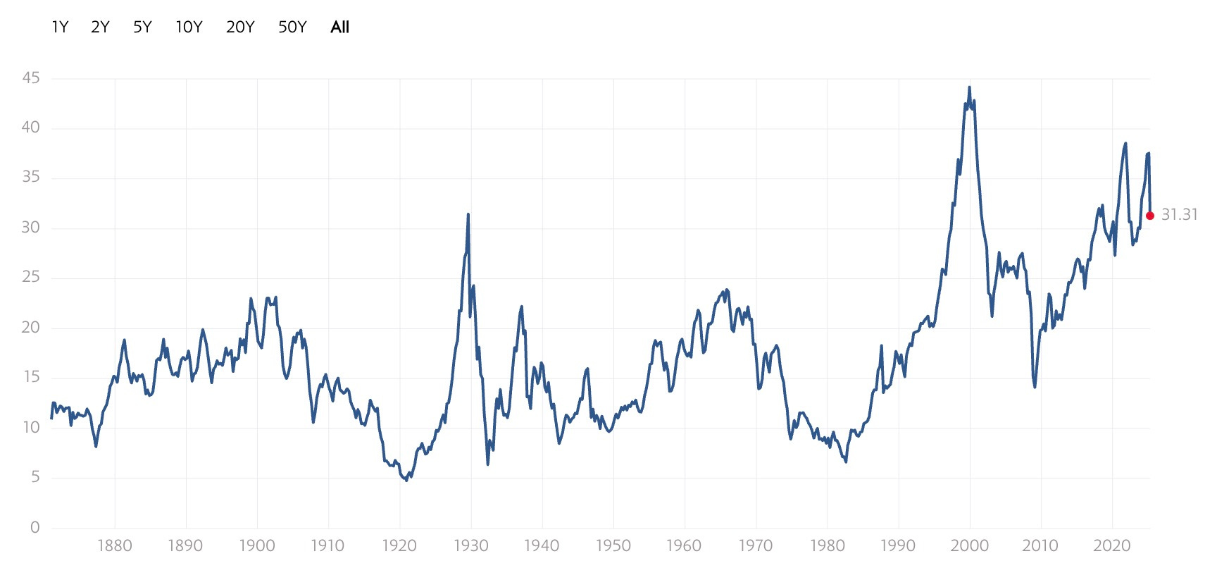 The Shiller price-to-earnings ratio was at its third highest level in recorded history, second only to right before the housing crisis and right before the 2000s tech bubble.