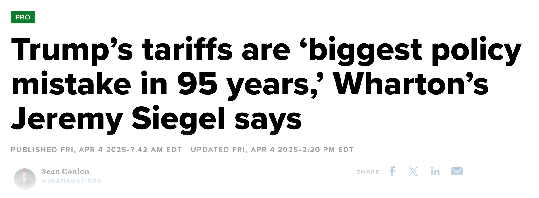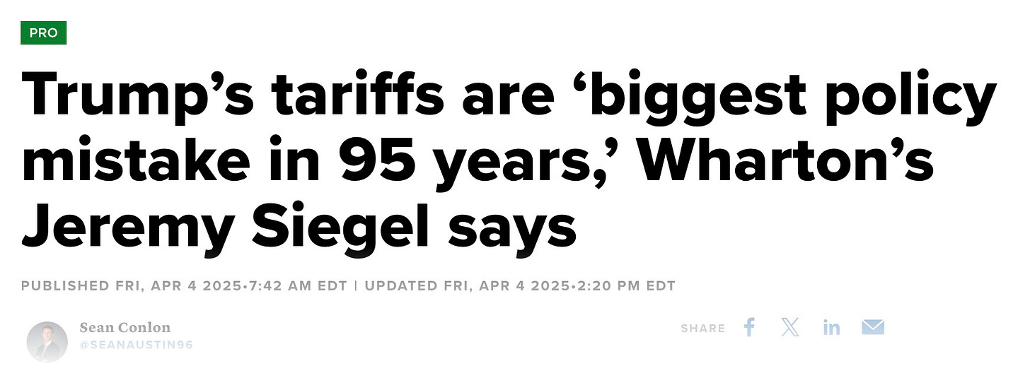 Let’s get one thing straight. The vicious pushback on these tariffs is, in my opinion, completely being driven by the move in the stock market. People were marching around waving Jeremy Siegel’s quote from yesterday that the tariffs are the ‘biggest policy mistake in 95 years’ like it was handed down from God himself.