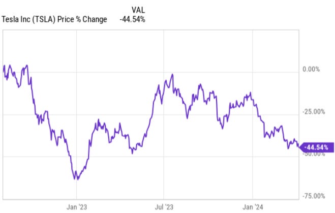 Since then, Tesla shares are down about 44% and being short Tesla was one of my 24 ideas for 2024. This year alone the stock is down 33.6%.