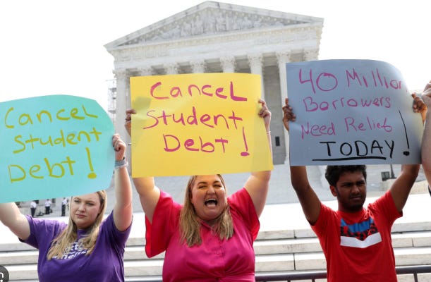 Many people made a bad investment decision by deciding to take out student loans, and they should have to suffer the consequences of such a decision. If you want to condemn the moral turpitude of these individuals at least be consistent. They are only doing what the banksters have done in past and are attempting to do with the commercial real estate bust. The banksters in both cases (the bankster bail out and now the commercial real estate bust have effectively privatized gains and socialized losses.(Heads-I win! Tails-you lose ( you being the taxpayers and the general public). This entire student loan forgiveness debacle is a just a sign of a deeper moral crisis in the character of the American people and the corrupt nature of the US government which seeks to shelter people (especially the rich and powerful) from the bad decisions they make. All these problems could be solved with a return to individual responsibility, and a government refusal to bail out people for the decisions they make.