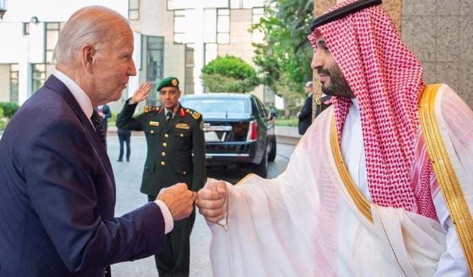 As if these challenges weren't enough to give one extreme pause, another war is erupting in the Middle East between Israel and Hamas. It's yet another global conflict that the United States and its allies seem hell-bent on supporting through financial and military aid. This conflict further dilutes our resources and intensifies the pressure on our already precarious fiscal situation. Saudi Arabia, who President Magoo believes is some kind of ally (see the famous photo below), has officially lent its support for Hamas.
