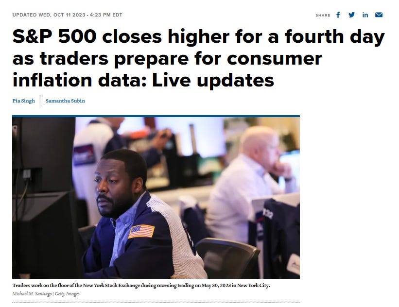 I mean, the market closed up for the 4th straight day on Wednesday, after inflation data came in above estimates (which should signal the Fed isn’t doing enough to beat inflation), after a war in the Middle East broke out (essentially doubling the potential geopolitical volatility on the horizon for the time being) and while valuations (market cap/GDP, P/E, throw a dart and pick one) remain near historic highs.