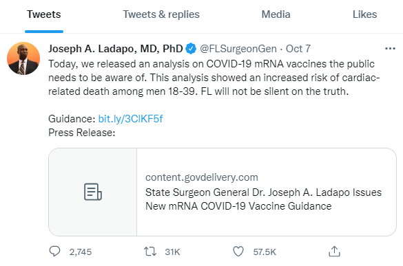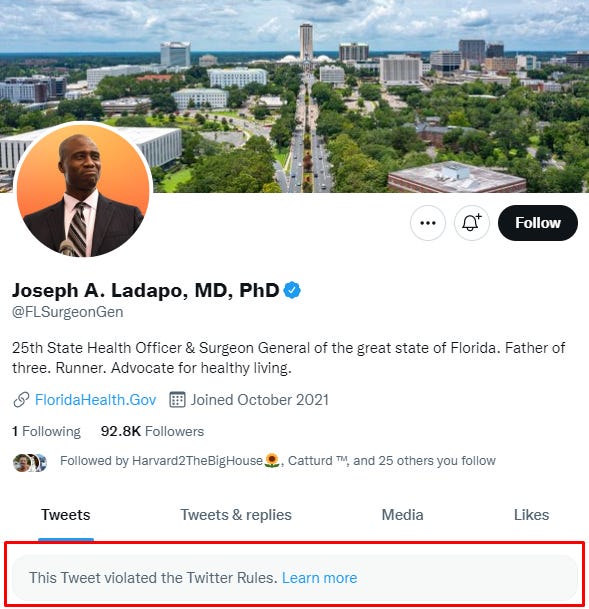 Then, after Florida’s own Surgeon General - who has a blue checkmark, almost 100,000 followers, an MD and PhD from Harvard and who formerly worked as a health policy researcher at the UCLA David Geffen School of Medicine - put out a Tweet with an official state press release and a link to the actual safety study and data, Twitter removed the post.