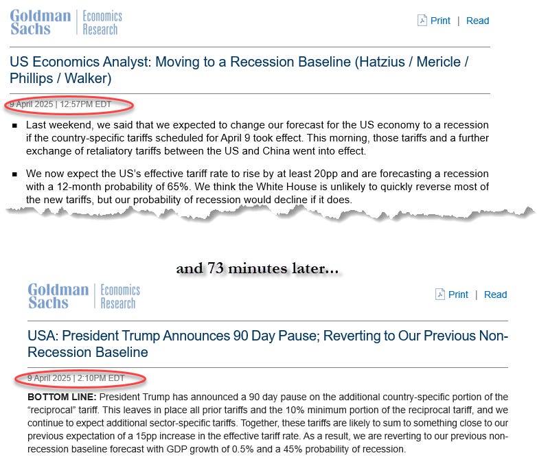 ZeroHedge made that point crystal clear when they put up the headlines from two Goldman Sachs notes—spaced 73 minutes apart—where they completely changed their recession forecast for the year:
